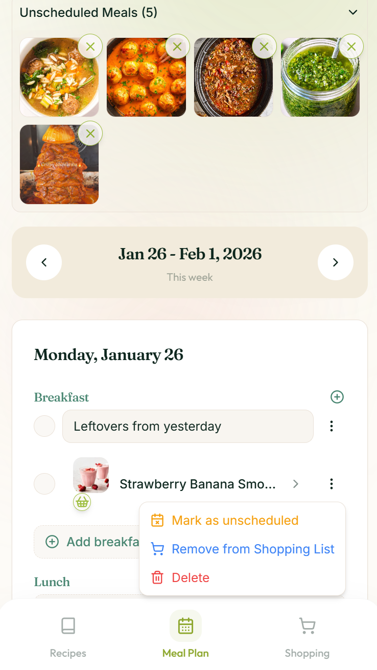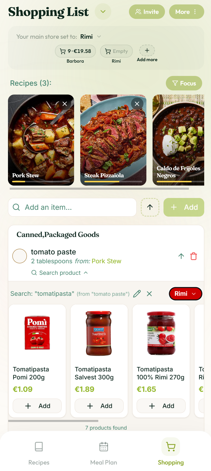 Your plan becomes an optimized shopping list instantly. Search for products or let our AI suggest them.